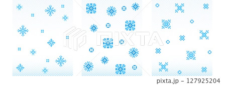 Pixel snow patterns set with blue snowflakes