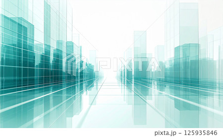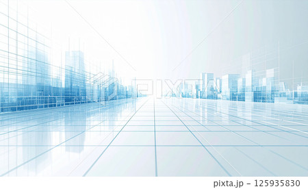 青いワイヤーフレームで描かれた未来都市の遠近風景
