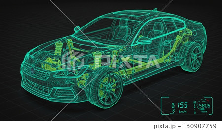 EV自動車の主要パーツと配線のワイヤーフレームのスケルトンCG画像