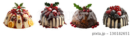 Christmas festive round pudding custard cake with frosting topping of pinecone, berries, cinnamon, holly, decorations on transparent PNG. Many different flavour. Mockup template for artwork design