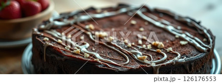 Delicious chocolate cake with nuts and drizzled frosting displayed on a rustic wooden table with fresh strawberries