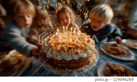 Group of excited children gather around lit birthday cake, ready to celebrate with joy and anticipation