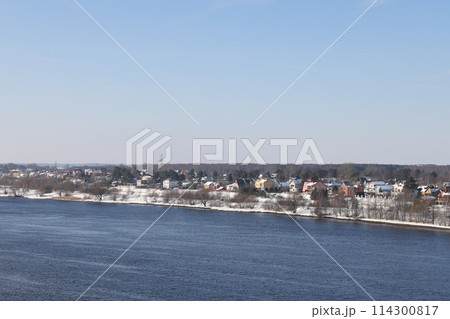 river on a sunny evening. Trees and shrubs. Landscape of winter nature, river banks