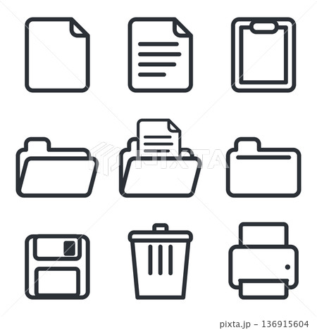 業務アイコンセット ドキュメントとフォルダ 書類 クリップボード フロッピー ゴミ箱 プリンター