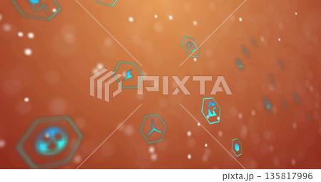 Floating turquoise hexagonal tech icons moving in abstract digital space, depicting energy symbols