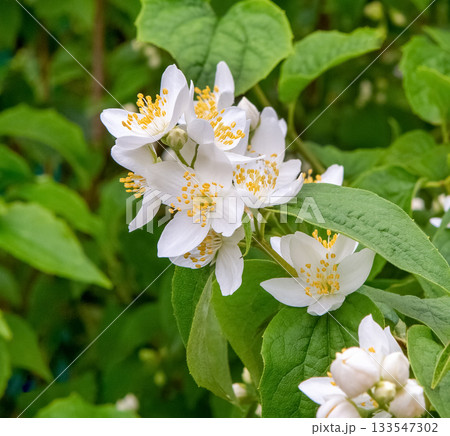 White Jasmine flowers close-up. Blooming jasmine shrub.