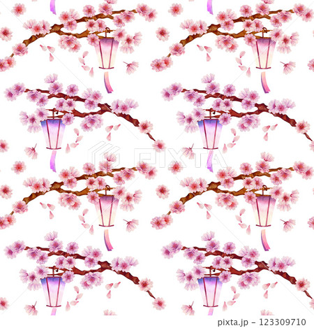 Branches of a spring tree blooming with flowers with a burning Japanese lantern. Seamless pattern of cherry, apple, almond petals on a white. Watercolor template for Hanami, textile, print, wallpaper,