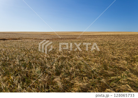 Expansive wheat field stretches under a bright blue sky, showcasing rippling golden stalks swaying gently in the warm sunlight