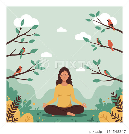 A woman meditating peacefully in nature surrounded by colorful birds and lush greenery in flat vector illustration