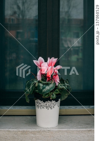 Beautiful pink cyclamen flower on the window.