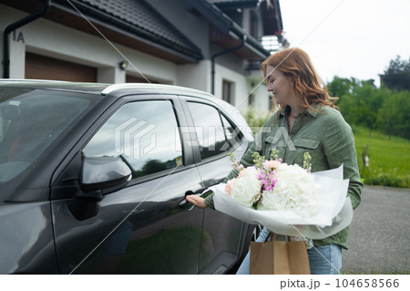 Female happy lady with bouquet of flowers near car outdoors. Sexy carefree woman posing on the street background