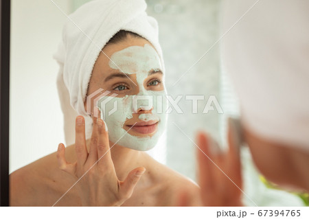 A woman holds a dollop of fluffy cream in her palm, preparing to apply it. The bright bathroom setting enhances the feeling of freshness suitable for Skincare advertising.