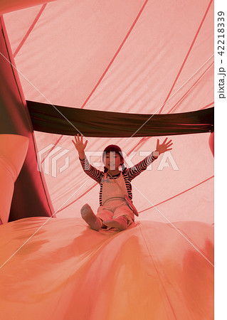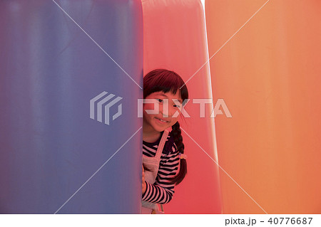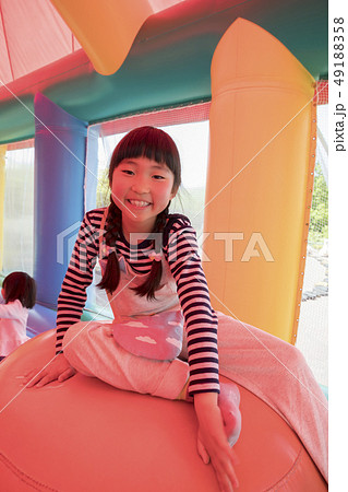 遊園地のエアー遊具であそぶ子供