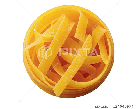 Close-up of uncooked pasta nests, showcasing vibrant golden hue and textured surface. Ideal for culinary websites, food blogs, and recipe publications.
