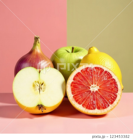 A vibrant display of fresh fruits features a cut apple revealing its juicy interior a whole apple a grapefruit and a lemon all on a contrasting pink and green backdrop.
