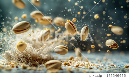 Pistachio nuts are captured mid-air, scattering and breaking apart