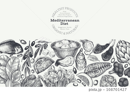 Mediterranean Cuisine Design Template. Vector Hand Drawn Healthy Food Banner. Vintage Style Menu Illustration.