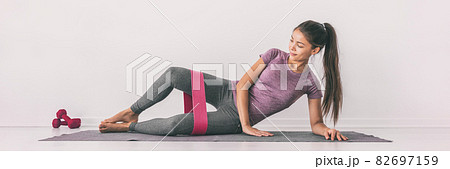 Resistance band clamshell exercise fit girl training legs on floor mat demonstration. Hip abductor workout for burning calories. Banner panorama