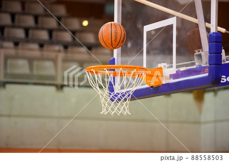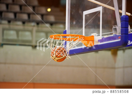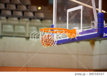 バスケットボールのシュートが入る瞬間のバスケットゴール