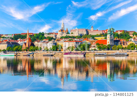 Panoramic view of the Buda skyline featuring Matthias Church, Fisherman's Bastion, St. Anne's Church and the Reformed Church in Budapest, Hungary