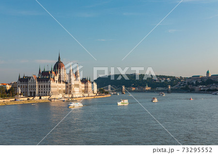 ハンガリー 夕暮れ時のブダペストの国会議事堂とドナウ川