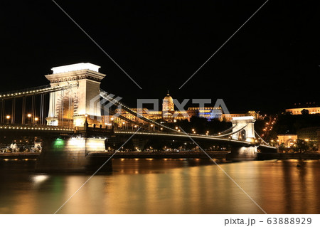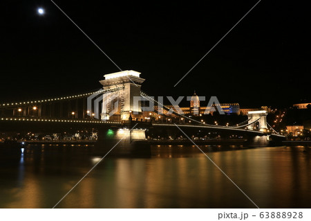 ハンガリー ライトアップされたブダペストのセーチェーニ鎖橋