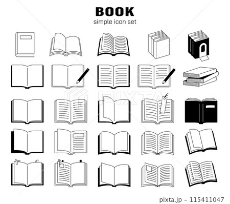 本 アイコン シンプル 線画 ベクター イラスト 素材 セット かわいい 読書 文具 ノート 白黒