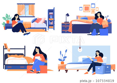 Hand Drawn A female character is reading a book in the bedroom in flat style