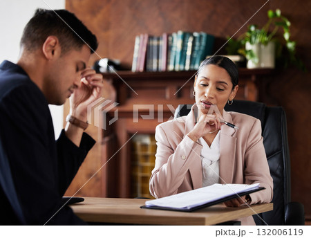 Corporate contract, woman lawyer and stress of client from legal documents and information. Business executer, will testament reading and sad man in a law firm office feeling upset about assets