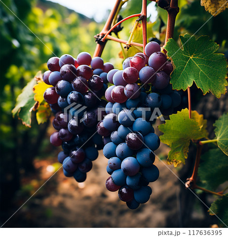 Sunny vineyard with clusters of ripe grapes in focus