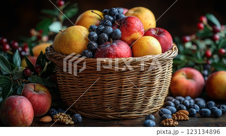 Rustic wicker basket filled with apples, grapes, pears, and berries on a wooden table. Concept of natural abundance, organic food, and seasonal harvest