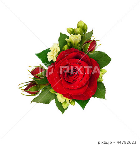 Composition with red roses and bouvardia flowers