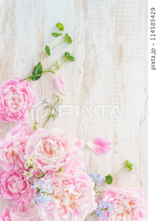 ピンクのピオニーとデルフィニウムのフラワーフレーム|縦構図
