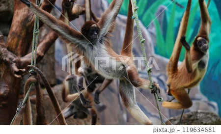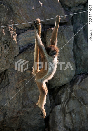 ワイヤーにぶら下がって遊ぶブラウンケナガクモザルの子供