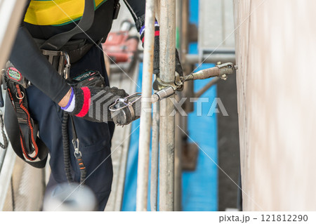 【マンション大規模修繕工事 壁つなぎを接続し足場を作る作業員】