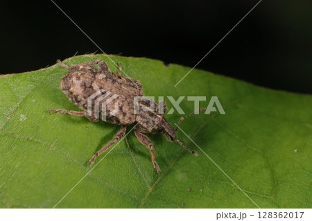 生き物 昆虫 ヤサイゾウムシ、体長八ミリ程。ざらついた感じの体に茶色系まだら模様
