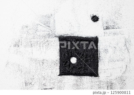 The black square from glitter with circular hole and the black circle from glitter outside on white background. Abstract minimalist composition from glitter