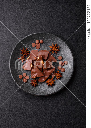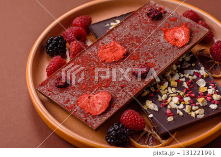 Bar sweet craft artisan chocolate with dried fruits made at home. Craft chocolate