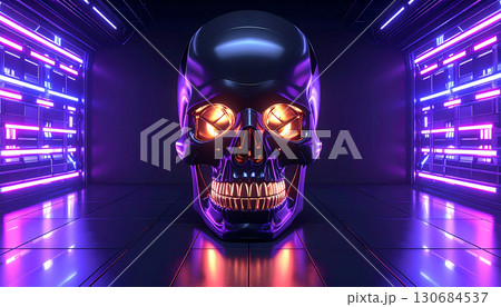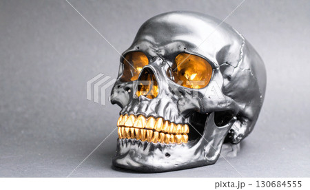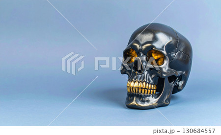 Matte Black Skull with Metallic Gold Teeth. Hallowen Concept. Generated Image