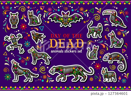 Day of the Dead mexican animal tattoo stickers, dead Halloween skeletons and calavera skulls at vector ethnic Mexico pattern background. Mexican Day of Dead dog, cat, bat and owl animal tattoos pack