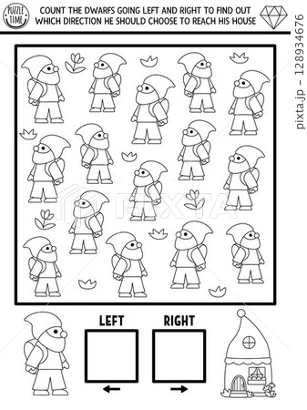 Dwarf logic game with left and right concept for kids. I spy black and white searching, counting activity with gnome searching way to house. Magic forest printable space orientation coloring page