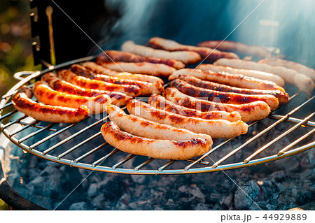 BBQ with fiery sausages on the grill