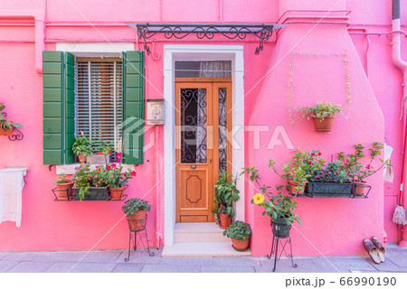 Pink house facade with flowers Burano Venice Italy