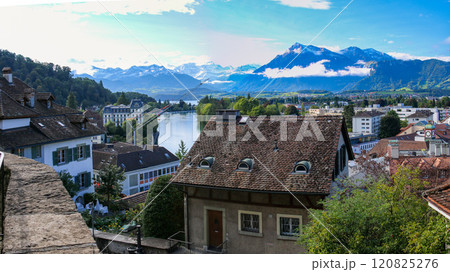 トゥーン旧市街越しのアルプスの風景 トゥーン湖畔のトゥーン城から インターラーケン スイス