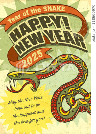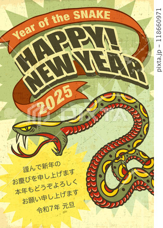 2025年賀状「レトロブリキ看板風デザイン」ハッピーニューイヤー 英語添え書き付パターン