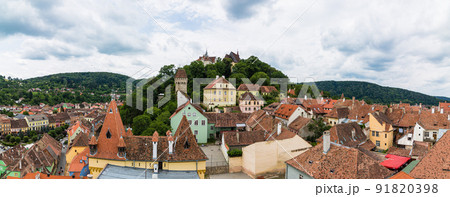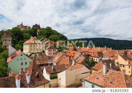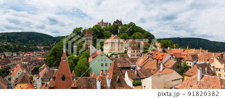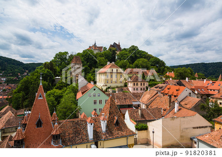 ルーマニア トランシルヴァニア地方のシギショアラの歴史地区にある時計塔の展望台から見える学校の山