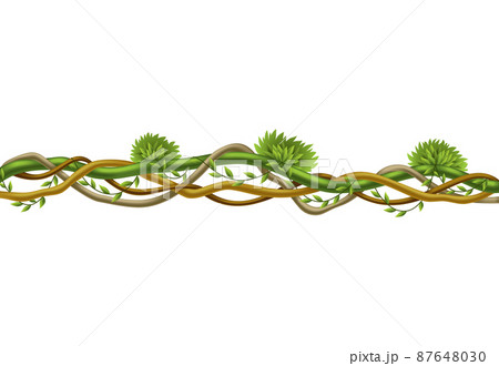 Liana stem border. Rainforest green vine or twisted plant hanging on branch. Cartoon jungle creeper. Tropical nature plant