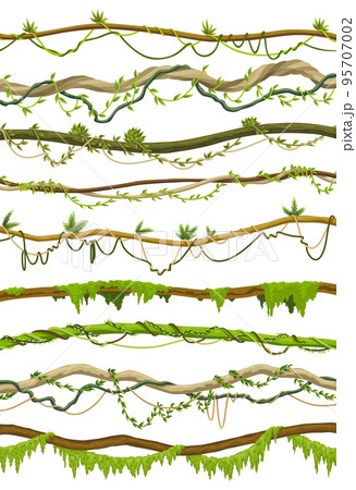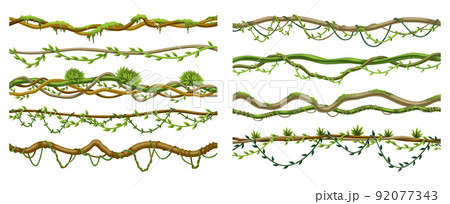 Lianas stems border set. Rainforest green vines or twisted plant hanging on branch. Cartoon jungle creeper branches, leaves and moss on tree. Vector isolated game scenery elements