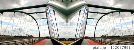 or a wide-angle shot of an iron bridge with visible construction or rope elements, set in an urban environment, with a blurred background and a two-lane road. urban bridge wide angle