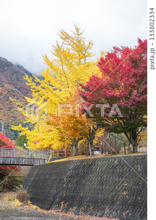 Colorful autumn trees with yellow and red leaves near mountain and bridge near Saiko Lake, Saiko, Fujikawaguchiko, Minamitsuru District, Yamanashi, Japan